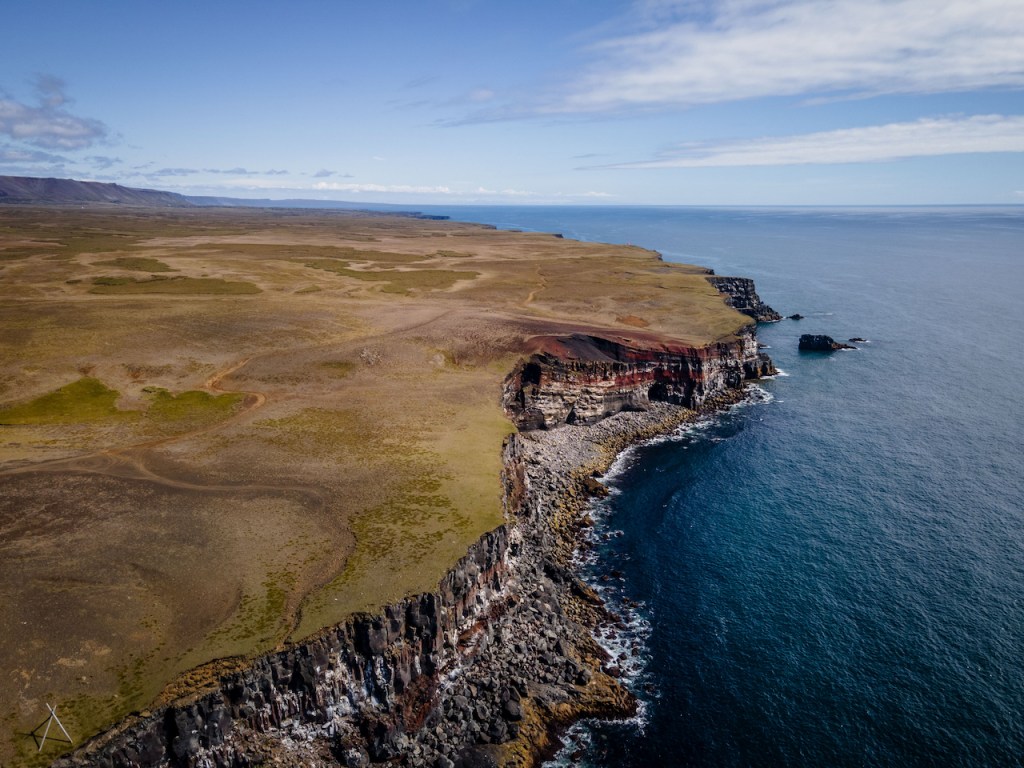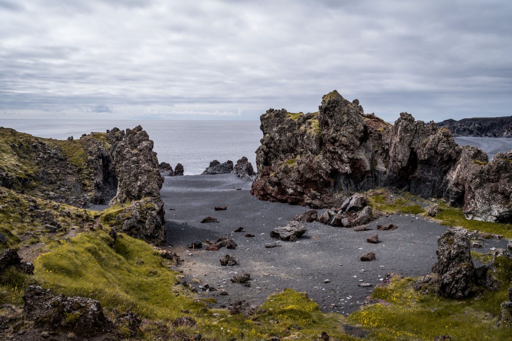 Nach der Stärkung fuhren wir anschließend weiter in Richtung Snæfellsnes. Hier wollten wir am Abend in Grundarfjörður mit Blick auf den Kirkjufell übernachten. Auf dem Weg dorthin fanden wir zufällig noch einen anderen, unbekannteren Wasserfall, der aber durchaus auch zu beeindrucken wusste. Nachdem wir in Grundarfjörður angekommen wären, machten wir uns direkt auf, die Halbinsel Snæfellsnes zu erkunden. Vom Kirkjufell ging es zunächst die Nordküste entlang bis nach Hellisandur und von dort in den Süden zum schwarzen Strand von Djúpalónssandur und den schroffen Felsformationen von Lóndrangar. Im Fischerdorf Arnarstapi ruhten wir uns dann in einem netten Kaffe erst einmal aus. Auf dem Rückweg zum Auto am Hafen wurden wir dann von wild gewordenen Küstenseeschwalben attackiert, die im Sturzflug einzelnen auf unsere Köpfe heruntergeschossen kamen. Offensichtlich führte die Hauptstraße des Ortes, auf der wir unterwegs waren, durch ihr Brutgebiet oder zumindest sehr nahe daran vorbei. Das war schon ein Erlebnis der anderen Art und wir waren froh, als wir wohlbehalten wieder im sicheren Auto waren.