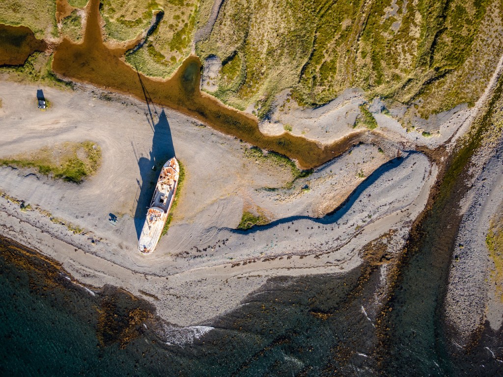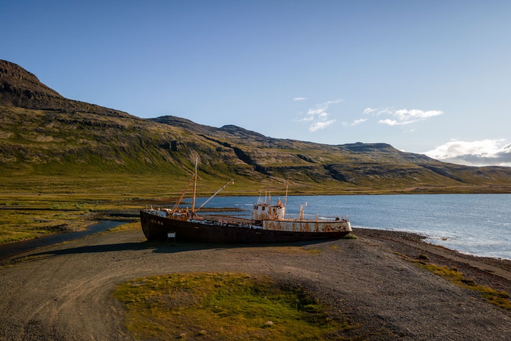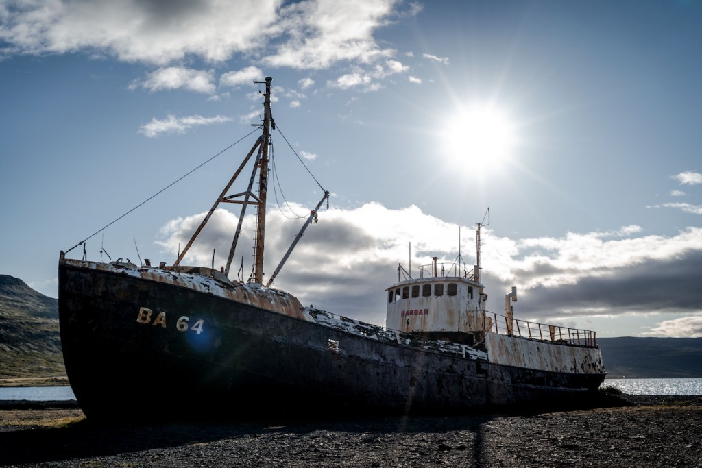 Entlang der Südküste der Westfjorde ging es über staubige Schotterstraßen – entweder entlang der Fjorde oder über die Berge dazwischen – zu unserem nächsten Etappenziel Patreksfjörður. Nachdem wir unsere Unterkunft bezogen hatten, machten wir uns wie so oft für den Abend noch einmal auf den Weg die Gegend zu erkunden. Am Anfang des gleichnamigen Fjords Patreksfjörður befindet sich ein auf Grund gesetztes Schiff als Sehenswürdigkeit der Gegend. Dieses wollten wir unbedingt sehen, dass wir es von Fotos her als sehr imposant empfanden. Bei der Garðar BA 64 handelt es sich um das älteste Stahlschiff Islands, welches ursprünglich in Norwegen erbaut und nach seiner Nutzung in Island 1981 außer Betrieb gesetzt wurde. Anstatt es wie zu damaliger Zeit üblich zu versenken, wurde es am Strand auf Grund gesetzt und rostet dort nun als Sehenswürdigkeit vor sich hin.