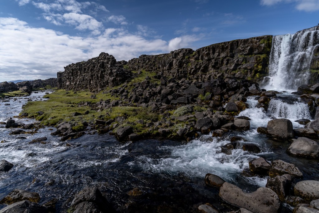 Am nächsten Tag brachen wir dann zum eigentliche Roadtrip rund um die Insel auf. Erste Station war der Þingvellir Nationalpark mit seinen Felsspalten, die durch das Auseinandertriften der amerikanischen und eurasischen Kontinentalplatten entstehen. Von dort entschieden wir uns spontan nicht die normale Route in Richtung Snæfellsnes zu nehmen, sondern ein Stück durchs Hochland zu fahren. Auch wenn wir nur einen kleinen Rand des Hochlands passierten, war die Weite der Landschaft hier schon sehr beeindruckend. Der Plan war zur Mittagszeit in Borgarnes zu sein und dort in der Pizzeria La Colina zu Mittag zu essen. Diese kannten wir ebenfalls bereits aus dem Vorjahr. Als wir ankamen, war sie allerdings noch geschlossen, sodass noch etwas Zeit zum Einkaufen blieb.