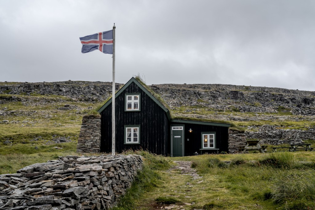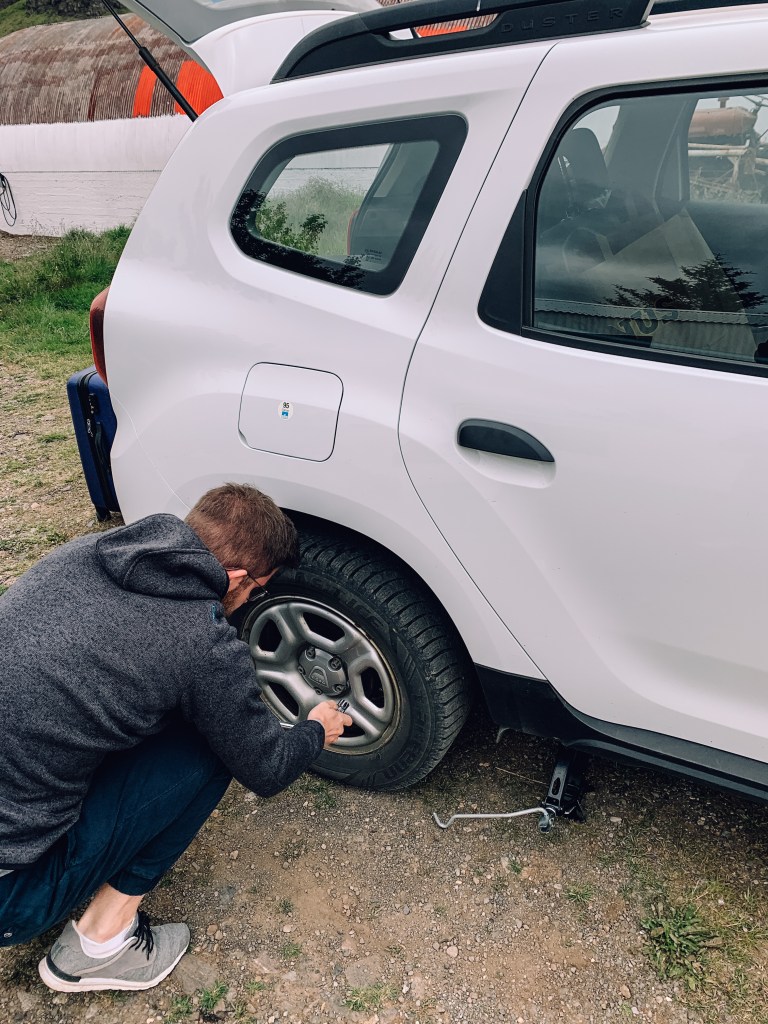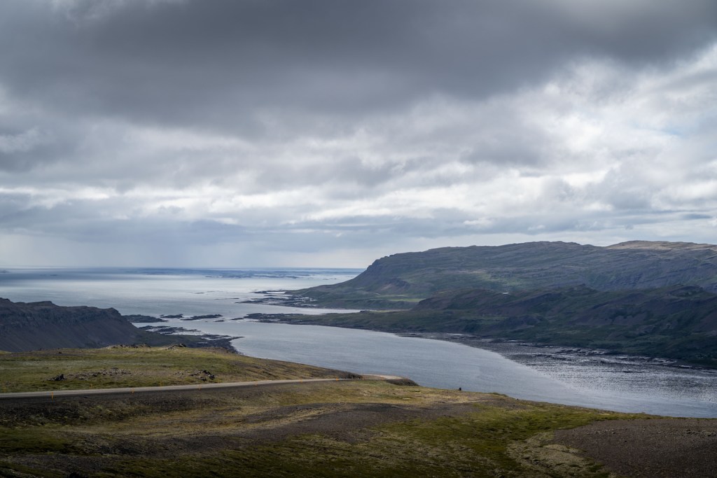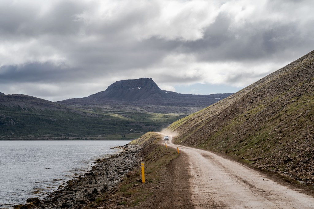 Am nächsten Morgen schauten wir uns noch das schöne Örtchen Stykkishólmur an und füllten unsere Vorräte im Supermarkt auf. Denn der nächste Teil unserer Strecke wies nicht wirklich viel Zivilisation auf. Immer entlang der Küste und mit schönem Meerblick fuhren wir nun westlich in Richtung Landesinnere. Hier machten wir auch zum ersten Mal richtige Bekanntschaft mit den berühmt berüchtigten Schotterstraßen Islands. Sehr grober Schotter und viele Schlaglöcher verlangten ein vorsichtiges und langsames Fahren. So blieb mehr Zeit die Landschaft zu genießen. Unsere Unterkunft für diesen Abend war dann auch sehr idyllisch ein kleines Häuschen mitten im buchstäblichen Nirgendwo. Seit Stunden waren wir durch keinen Ort mehr gefahren und auch rundherum waren nur Felder und vereinzelte Häuser zu sehen. Nach einer ruhigen Nacht am nächsten Morgen dann der Schreck: Als wir das Auto zur Weiterfahrt packen wollten, stellten wir fest, dass einer unserer Reifen platt war. Also hieß es nun, Hand anlegen und den Reifen durch das zum Glück vorhandenen Ersatzrad zu ersetzen. Es war aber klar: Damit können wir nicht in die Westfjorde fahren, wo die Straßen noch schlechter sein sollten und es kaum Infrastruktur gab. Aber auch hier waren wir ja im Nirgendwo und wussten nicht, wie das nun mit einem neuen Reifen für den Mietwagen vonstatten ging. Zum Glück half uns die Autovermietung aber mit einer Werkstatt im nächsten, sehr kleinen Ort Búðardalur weiter. Nach kurzem Zweifel, ob es in diesem Nest wirklich eine Autowerkstatt gab, fanden wir sie glücklicherweise. Aber: Sie machten gerade Mittagspause. Mit der Zeit im Nacken warteten wir also eine Stunde und bekamen dann ohne Probleme direkt einen vollwertigen Reifen verkauft und wir konnten endlich unsere Fahrt in die Westfjorde fortsetzen.