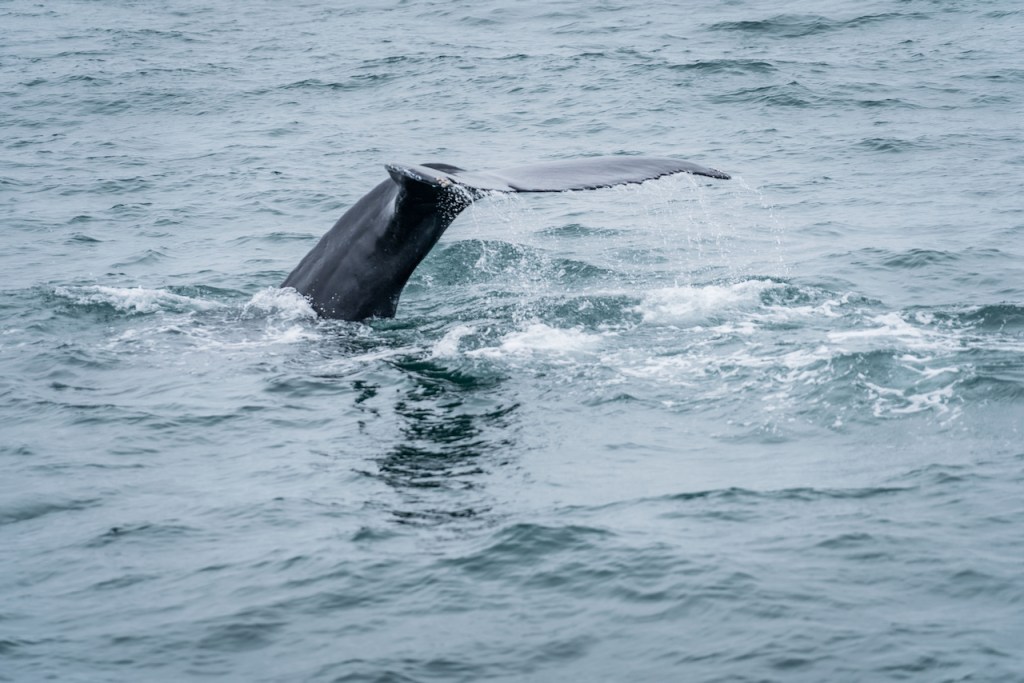 Am nächsten Tag hatten wir uns als Highlight eine Whale Watching Tour in Húsavik vorgenommen. Voller Vorfreude zogen wir unsere Wärmeoveralls an und bestiegen den historischen Kutter, um damit rauszufahren. Bei der Ausfahrt aus dem Hafen erzählte uns die Guide noch, dass an diesem Tag ein sehr moderater Wellengang sei. Kurz danach sollte sich jedoch für uns herausstellen, dass zumindest Cora und ich selbst diesem nicht gewachsen waren. Cora musste sich bereits kurz nach dem Hafen in den hinteren Teil des Schiffes verziehen, weil ihr so schlecht wurde. Ich wollte jedoch unbedingt einen Wal sehen und auch fotografieren. Daher stieg ich auf die Aussichtsplattform auf dem Führerhaus des Schiffes und hielt, die Kamera im Anschlag, Ausschau nach den Riesen des Meeres. Glücklicherweise konnte ich noch kurz einen Wal erspähen und teilweise fotografieren, bevor auch mich mit Wucht die Übelkeit überkam. Schnellstmöglich packte ich die Kamera weg und beeilte mich von der Aussichtsplattform zu kommen, da ich fürchtete mich zu erbrechen, was sich zwangsläufig auf andere Mitreisende an Deck unter mir ergossen hätte. Ich eilte also ebenfalls ans Heck, setzte mich zu Cora und den anderen Seekranken, hielt für den Rest der Fahrt (es waren noch 2 Stunden) die Bootsfahne am Heck umklammert (natürlich nur, damit diese nicht wegflog) und fütterte die Fische. Noch nie in meinem Leben war mir so schlecht, wie in dieser Situation. Mein Körper rebellierte dermaßen, dass ich meinen Wärmeanzug öffnen musste, weil ich Wind und niedrigen Temperaturen schwitzte, als wäre ich in der Sauna. Nach dem wir endlich den rettenden Hafen erreich hatten, erholte sich mein Magen zum Glück schnell wieder, sodass ich die Besichtigung des Ásbyrgi-Canyons sowie der Wasserfälle Hafragilsfoss und Dettifoss genießen konnte, bevor wir am Abend in unsere Unterkunft in der Nähe des Myvatn kamen.