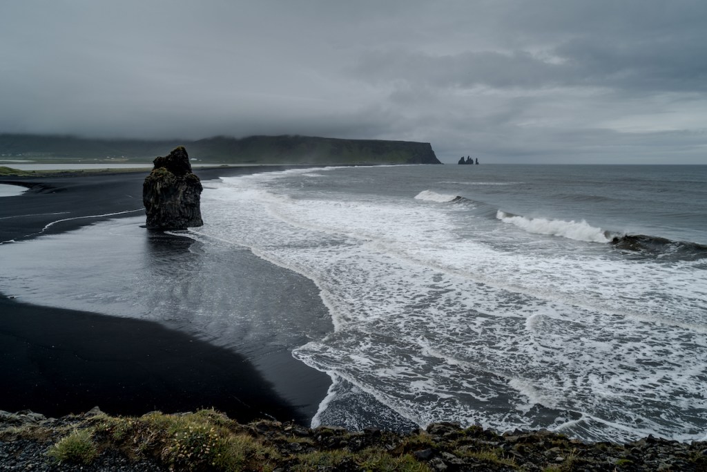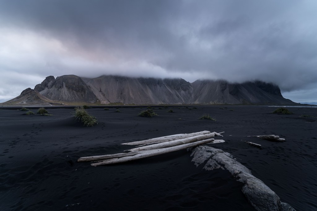 Als nächster Stop durfte natürlich Stokksnes nicht fehlen. Ebenfalls einer dieser einmaligen, wunderbaren Orte in Island, den man nicht mehr vergisst. Der endlose schwarze Strand mit den dahinter aufragenden zackigen Felsen ist jedes Mal wieder sehenswert. Entsprechend durfte er auch auf keiner unserer bisherigen Islandreisen fehlen. Dieses Mal hatten wir jedoch etwas Pech mit dem Wetter. Leider hingen die Wolken sehr niedrig, sodass von den Felszacken des Vestrahorns nicht viel zu sehen war. An diesem Abend übernachteten wir in einer Pension auf einem Pferdehof. Die Besitzerin, eine Isländerin, war mit einem Österreicher verheiratet und hatte eine zeitlang in Hamburg gelebt. Sie hatte einiges zu erzählen, zum Beispiel über die Vulkane, wie diese überwacht werden und was passiert, wenn einer ausbrechen sollte. Tatsächlich wartete man dort auch auf den nächsten Ausbruch eines nahegelegenen Vulkans. Über Nacht zog ein starker Sturm auf, sodass am nächsten Morgen alle Straßen in Richtung Süden gesperrt waren. Wir saßen also fest und mussten zunächst warten, bis sich er Sturm beruhigt hatte. Hier muss man wissen, dass ein starker Sturm in Island nichts mit einem starken Sturm hier bei uns in Deutschland zu tun hat. Das ist dagegen ein laues Lüftchen. Man ist also gut beraten, um Haus zu bleiben. Als wir denn gegen Mittag wieder weiter fahren konnten, besuchten wir zunächst die Gletscherlagune Jökulsárlón, die wir unseren Freunden unbedingt zeigen wollten. Leider war es noch immer sehr windig und regnet stark, sodass wir hier nur kurz hielten und anschließend weiter in Richtung Vík fuhren.